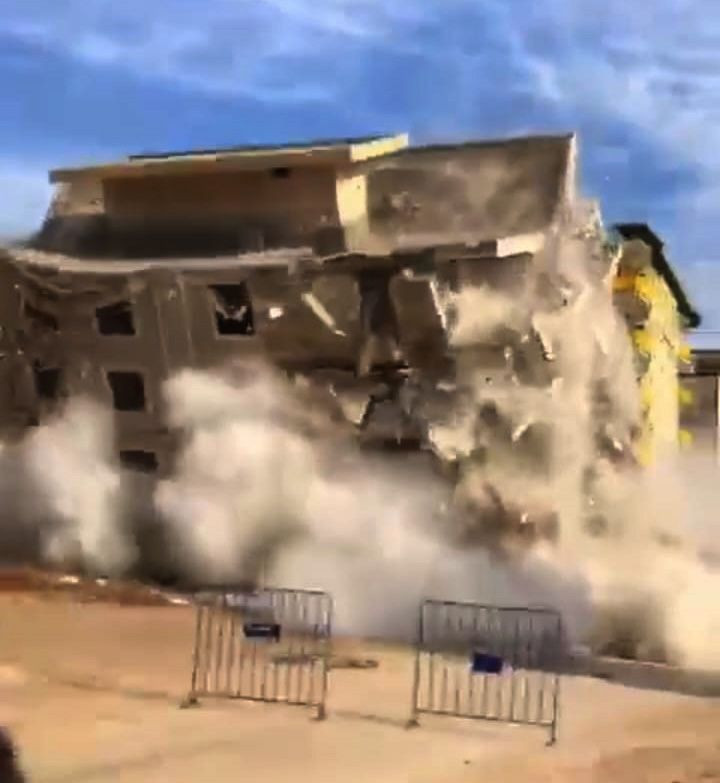 Çevrede bariyerlerle güvenlik önleminin alınmasının ardından iş makineleriyle yapılan kontrollü yıkım sırasında, bina aniden çöktü.