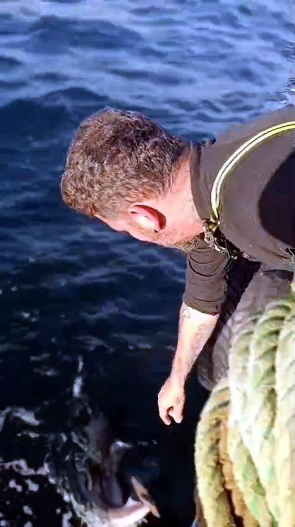 Kırklareli'de Karadeniz'e açılan balıkçı Yasin Püsküllü, ağına takılan avlanması yasak ve koruma altındaki camgöz cinsi köpek balığını, yeniden suya bıraktı.