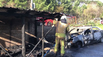 Beykoz'da bir garajda çıkan yangın, garaj yakınında bulunan otomobile de sıçradı. Garaj ve otomobil yanarak adeta kül olurken, o anlar ise korkuya neden oldu.