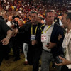 Öte yandan tribünden sahaya giren bir kişi, arkadan gelerek Ali Koç'a saldırdı. Ali Koç yere düşerken, güvenlik görevlileri saldırgana müdahale etti. Olayın ardından duraklatılan maç, Koç'un soyunma odasına gitmesiyle kaldığı yerden devam etti.