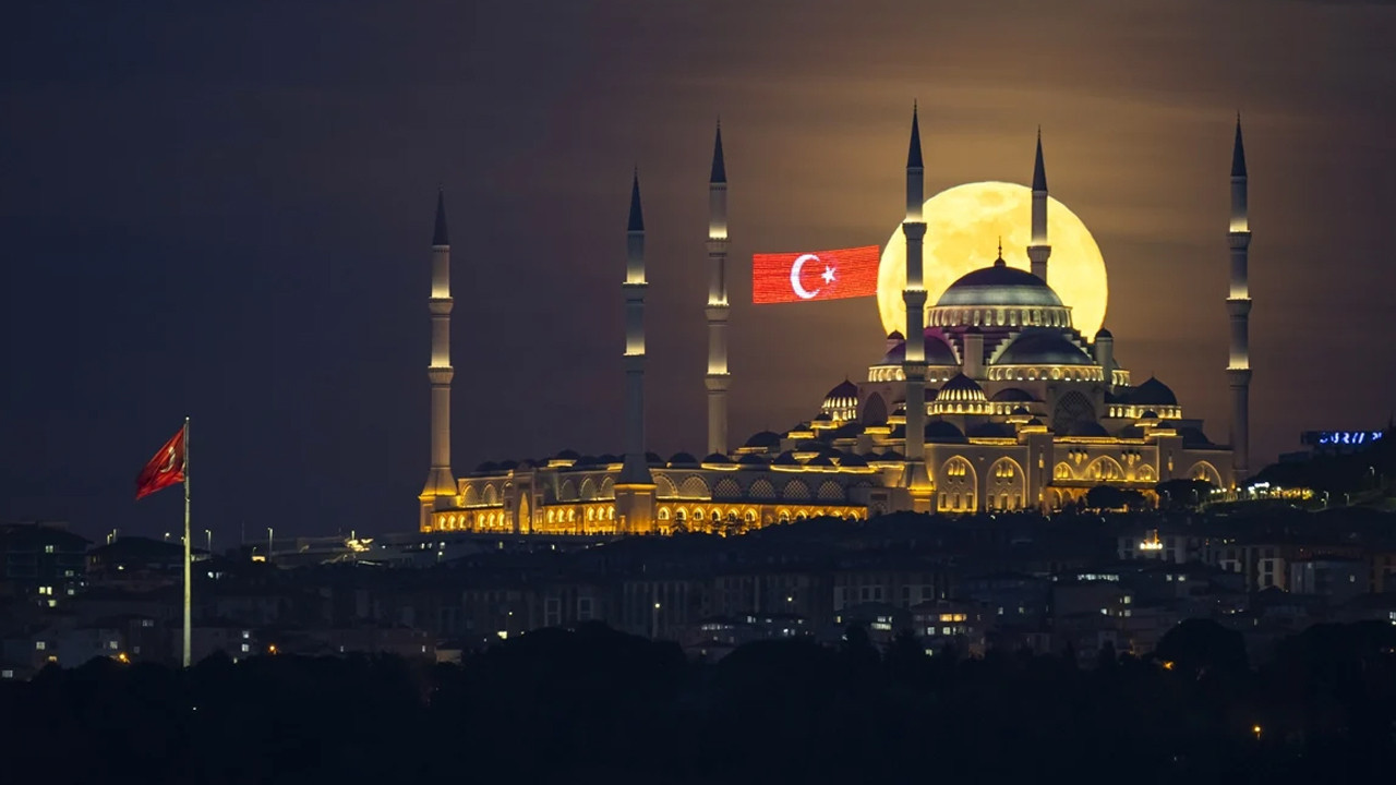 Gökyüzünün karanlığına doğru yükselen dolunay, caminin minareleriyle ahenk içinde muhteşem bir manzara oluşturdu.