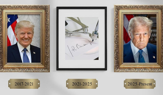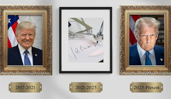 ABD Başkanı Trump, bu benzetmesinin bir adım ileriye taşıdı ve Beyaz Saray'daki "Başkanlık Onur Yolu" olarak bilinen bölüme, selefi Joe Biden'ın portresi yerine, belgeleri otomatik olarak imzalayan otomatik kalem illüstrasyonunu yerleştirdi.
