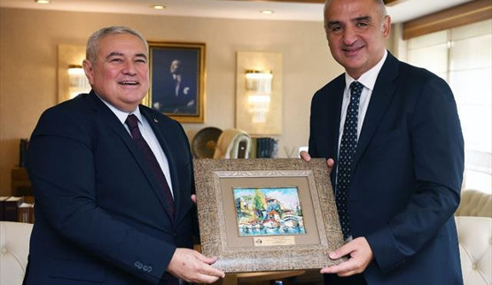 Programa katılmaktan memnuniyet duyacağını vurgulayan Başkan Çetin, Kültür ve Turizm Bakanı Mehmet Nuri Ersoy'a ziyaretin anısına ATSO Güzel Sanatlar Lisesi öğrencileri tarafından çizilen sulu boya Kaleiçi tablosunu armağan etti.