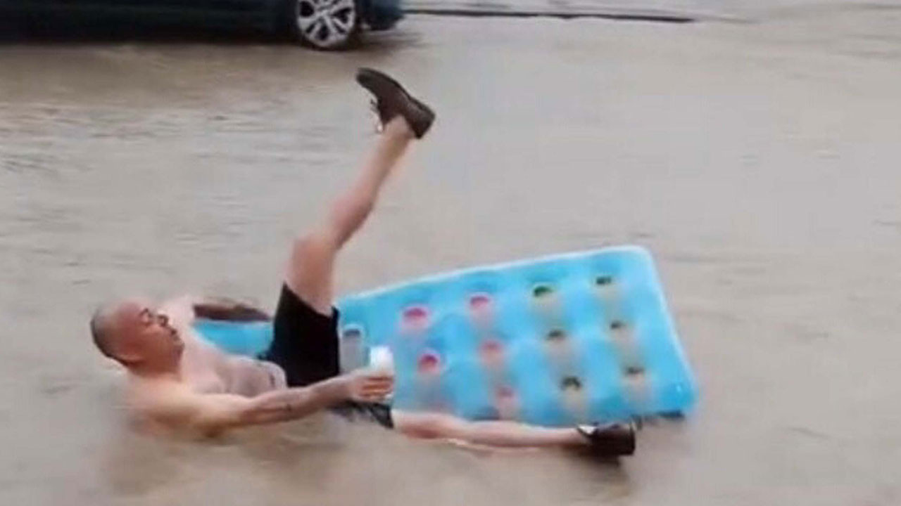 Muğla'nın Fethiye ilçesinde etkili olan yağmur, yabancı bir turistin eğlencesi haline dönüştü. Suyla dolan caddede deniz yatağına uzanan bir turist içeceğini yudumlayıp, anın keyfini çıkarırken o anlar çevredekiler tarafından cep telefonuyla görüntülenip, sosyal medyada paylaşıldı.