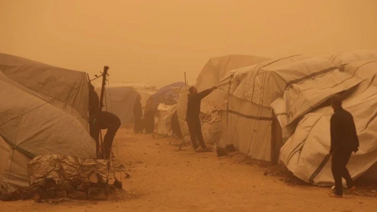 Etkili olan şiddetli rüzgar ve olumsuz hava koşulları kum fırtınasına neden olurken çok sayıda çadır, hasar görme noktasına geldi.