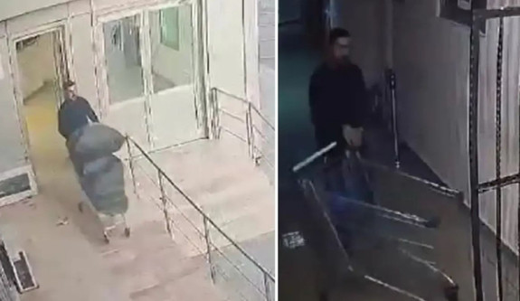 Görüntülerde, şüpheli Erdal T.’nin market arabasıyla içeri girdiği ve emanet bürosundaki değerli eşyaları çöp poşetine doldurarak arabayla taşıdığı görülüyor.