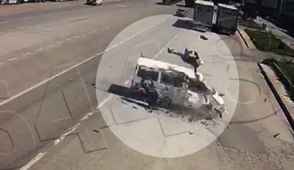 Amasya'da meydana gelen feci kazada minibüsle çarpışan motosikletteki şahıs hızla havalanarak minibüsün üstüne düştü. O anlar çevredeki güvenlik kameralarına saniye saniye yansıdı.