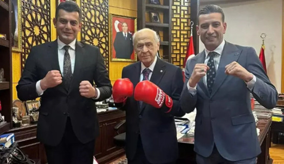 Bahçeli, makamında gerçekleşen ziyarette boks eldiveniyle kameralara poz verdi.