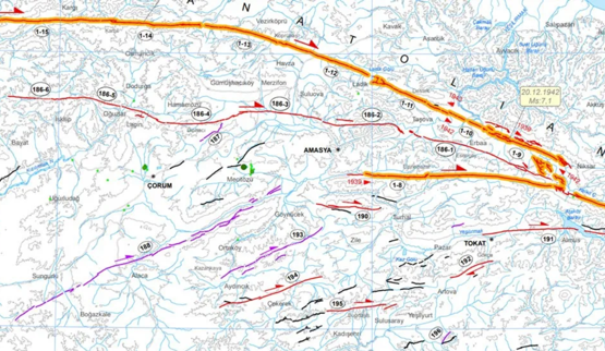 "Kuzey Anadolu Fayı Niksar’da iki kola ayrılır. Güneydeki kol 1939 Erzincan depreminin kırılan en batı ucunu oluşturur. Niksar’dan Taşova Kargı ve Tosya’ya uzanan ana kol 1942 ve 1943 depremleri ile kırılmıştır.