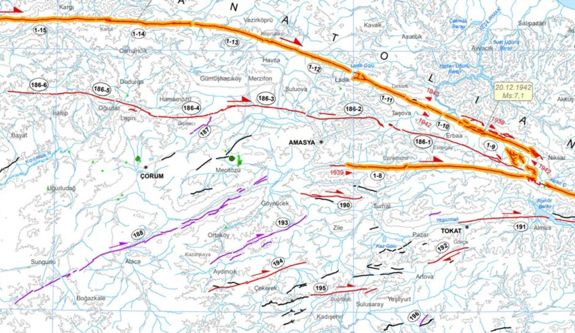 "Niksar’dan batıya doğru uzanan bir başka fay kolu ise Esençay, Suluova güneyi, Hamamözü, Merzifon ve Laçin’den geçer. Merzifon ovasından Sıklık boğazına ve Çorum’a uzanan faylar da varsa da bunlar MTA haritasında pek aktif olmayan sınıfa konulmuşlardır."