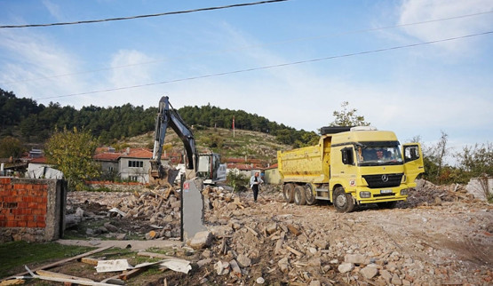 Son dönemde depremlerle sallanan Balıkesir Sındırgı'da ağır hasar tespiti yapılan kırsal mahallelerdeki yapılarda kontrollü yıkım çalışmaları sürüyor.