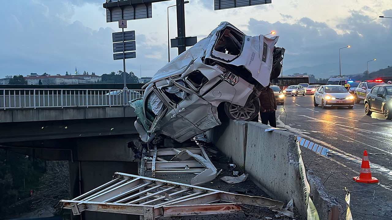 İzmir'in Buca ilçesinde, 'Uçan Yol' olarak bilinen Homeros Bulvarı'nda freni boşalan çekicinin viyadükten aşağı uçtuğu, bir otomobilin ise asılı kaldığı kazada 1'i ağır 3 kişi yaralandı.