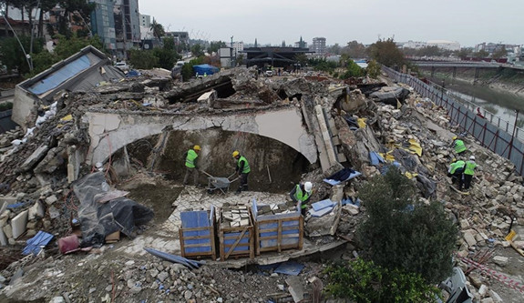 Doğuş Grubu sponsorluğunda uzman ekiplerce çalışmalara başlanan tarihi iki yapıda, ilk aşamada molozlar ayrıştırılıyor.
