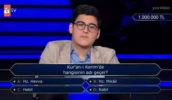 "Kur'an-ı Kerim'de hangisinin adı geçer?" Şıklar arasında Hz. Havva, Hz. Mikail, Habil ve Kabil bulunuyordu. Çulha'nın tercihi Hz. Havva olurken, doğru cevap B şıkkındaki Hz. Mikail'di.