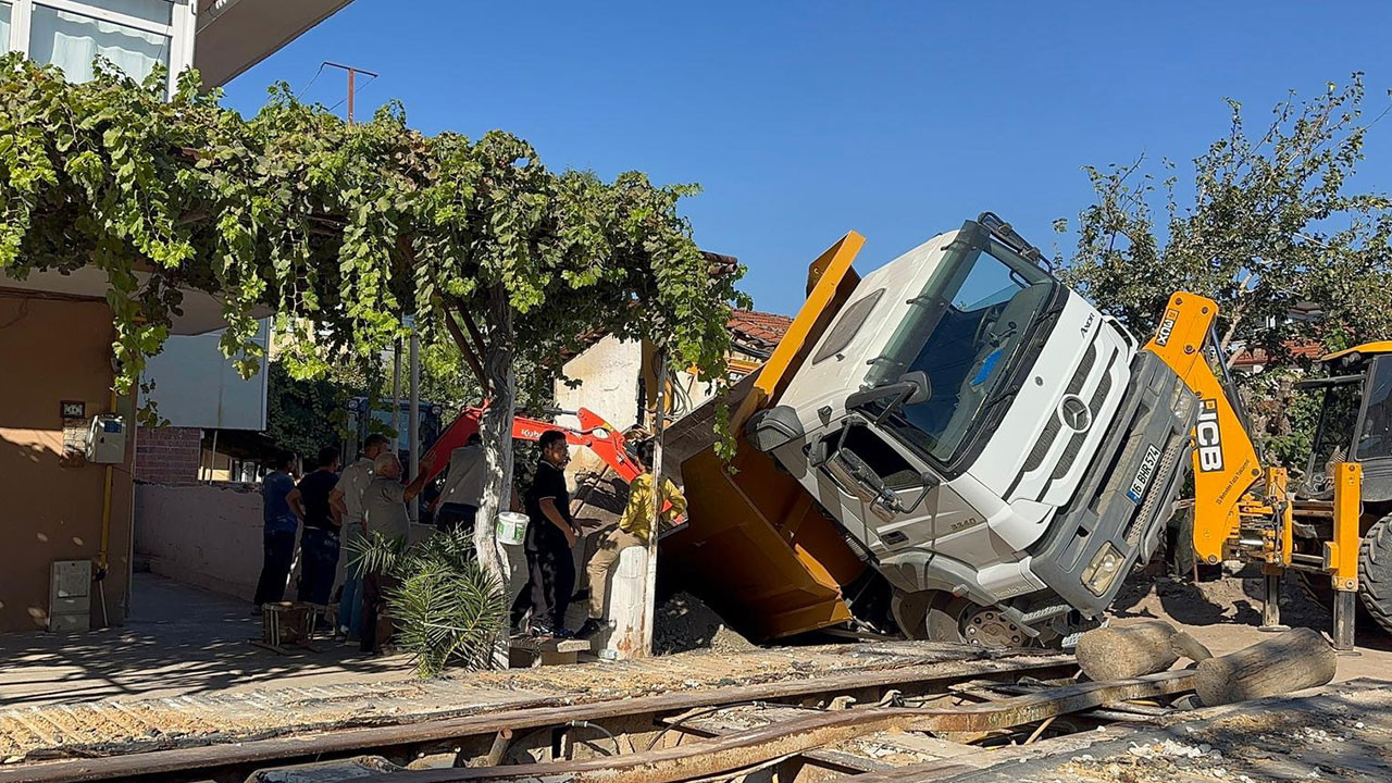 Zemin çöktü, kum yüklü kamyon foseptiğe düştü